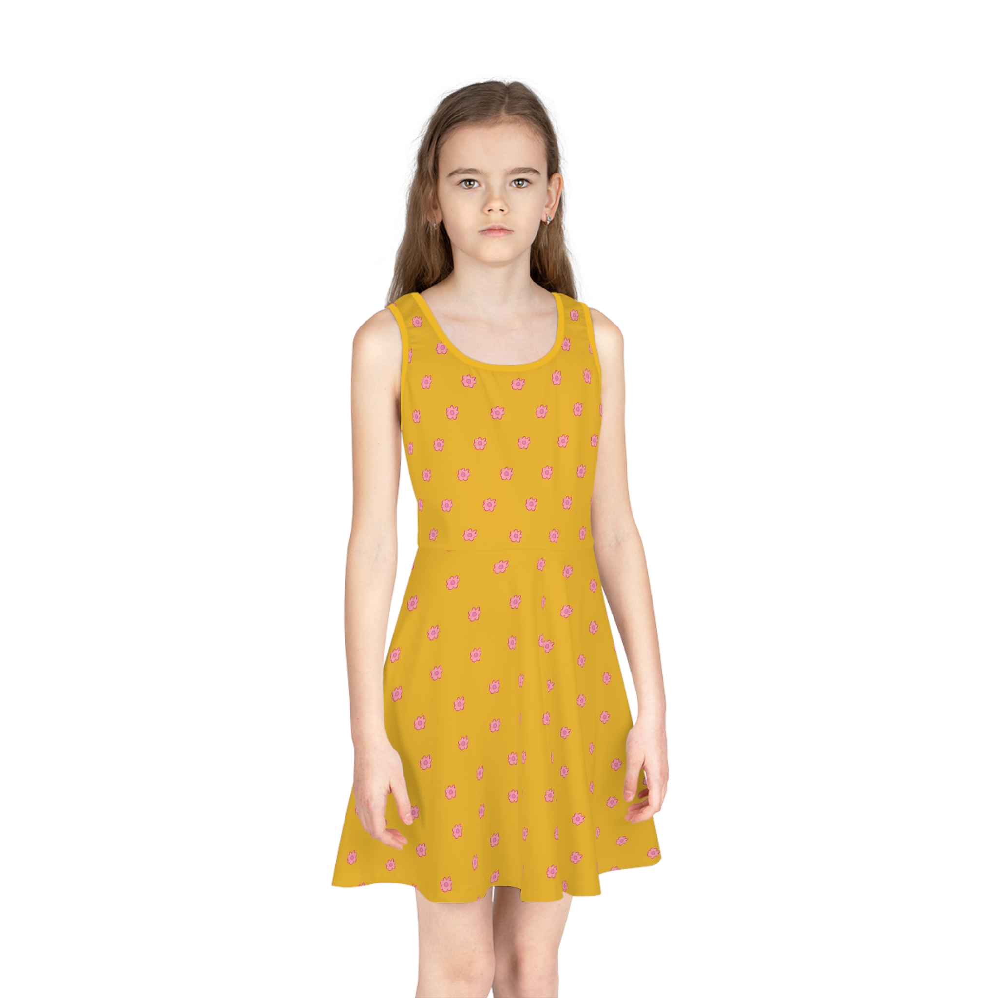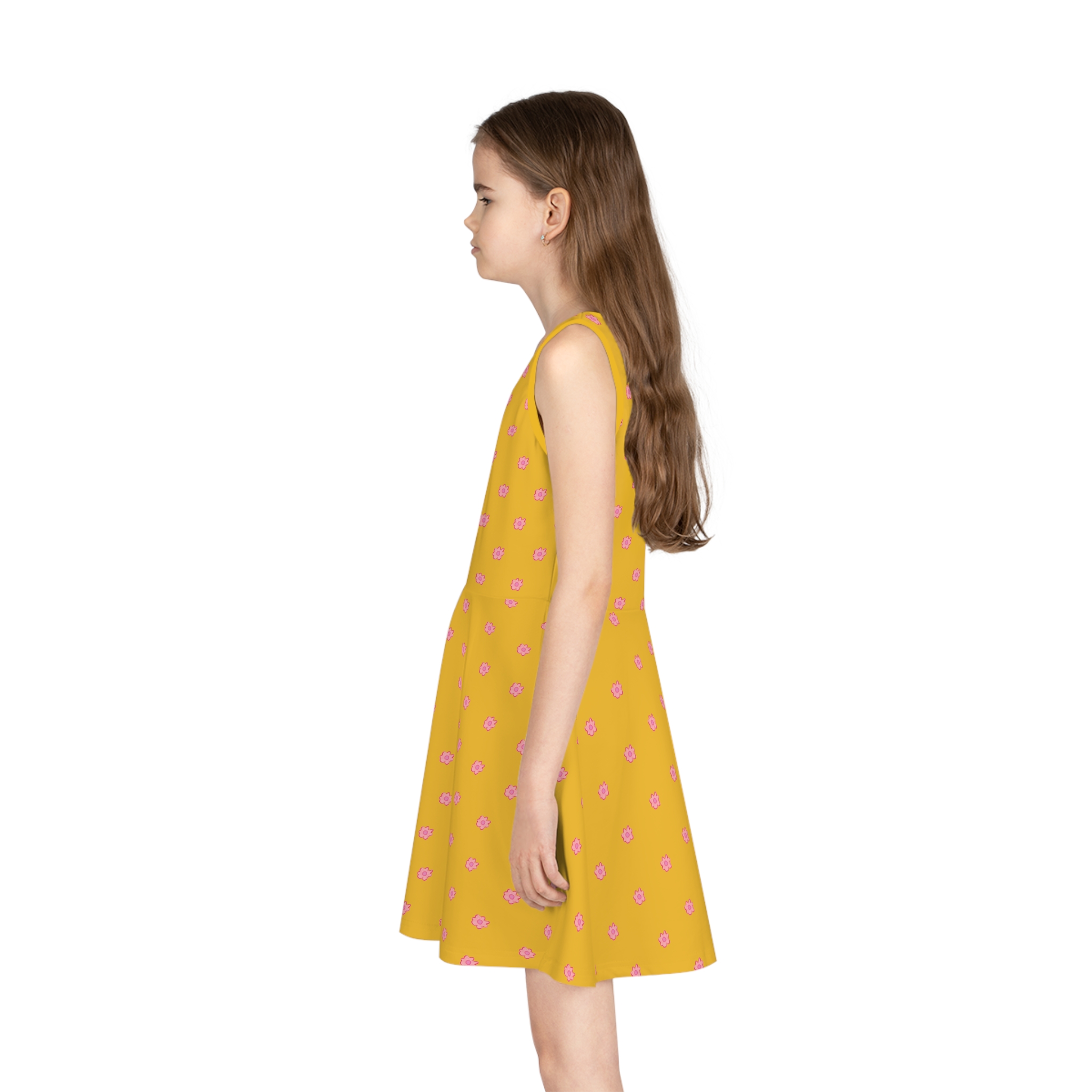 Be the first to review “Girls’ Pink Flower on Yellow Sleeveless Sundress (AOP)”